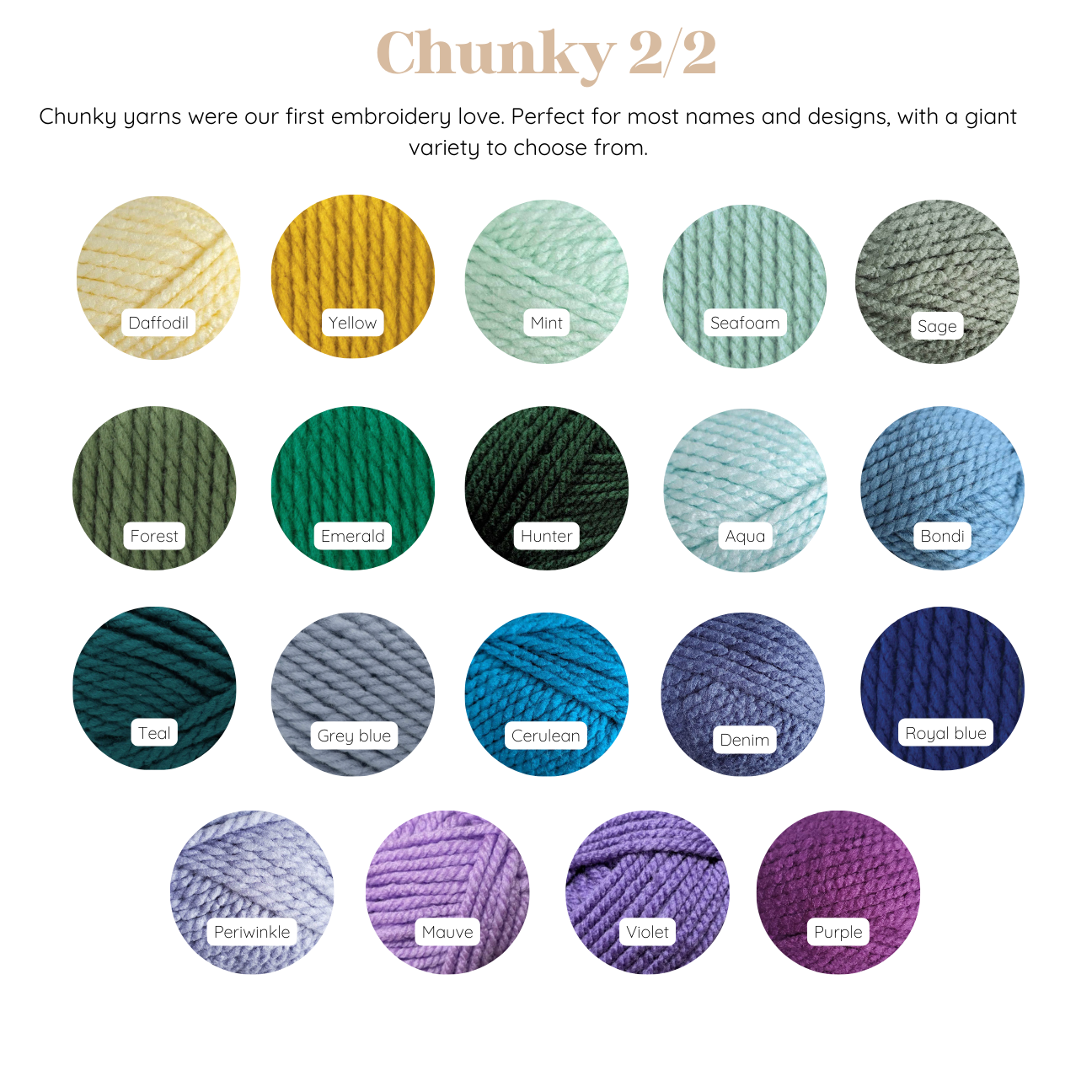 Type the name in all CAPS for this chunky letter option. Select one or more yarn colours for the lettering.